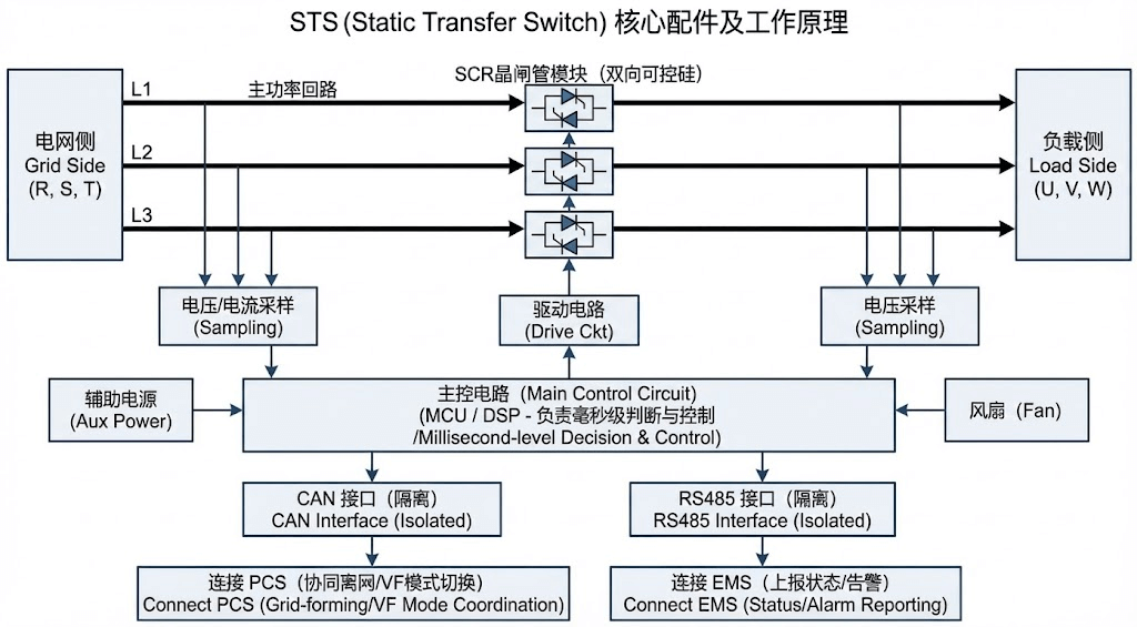 - 通讯协同:STS提供两路隔离通讯接口:CAN接口与PCS进行毫秒级的数据交互(如下发相位角、协同模式切换);RS485接口连接EMS进行状态监控。