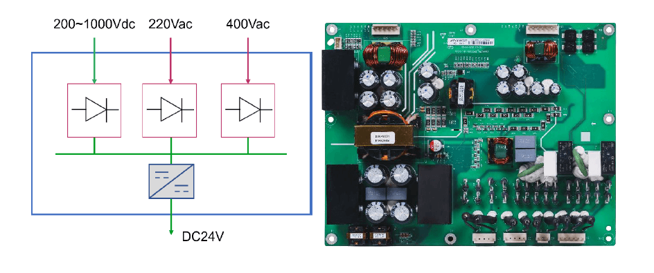 它具备三路输入,可分别从市电侧、PCS交流侧和电池直流侧获取电源,并输出24Vdc,确保STS的正常运行和通讯。确保在电网掉电(AC Grid Loss)且PCS尚未建压(AC Load Loss)的全系统失电工况,STS控制器依然有电来执行逻辑判断和CAN通讯。