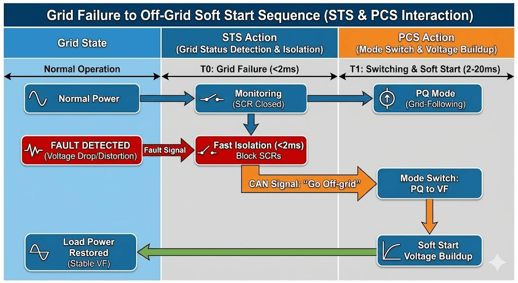 - 动作:PCS在VF模式下输出电压,支撑负载。STS保持断开,实现物理隔离。