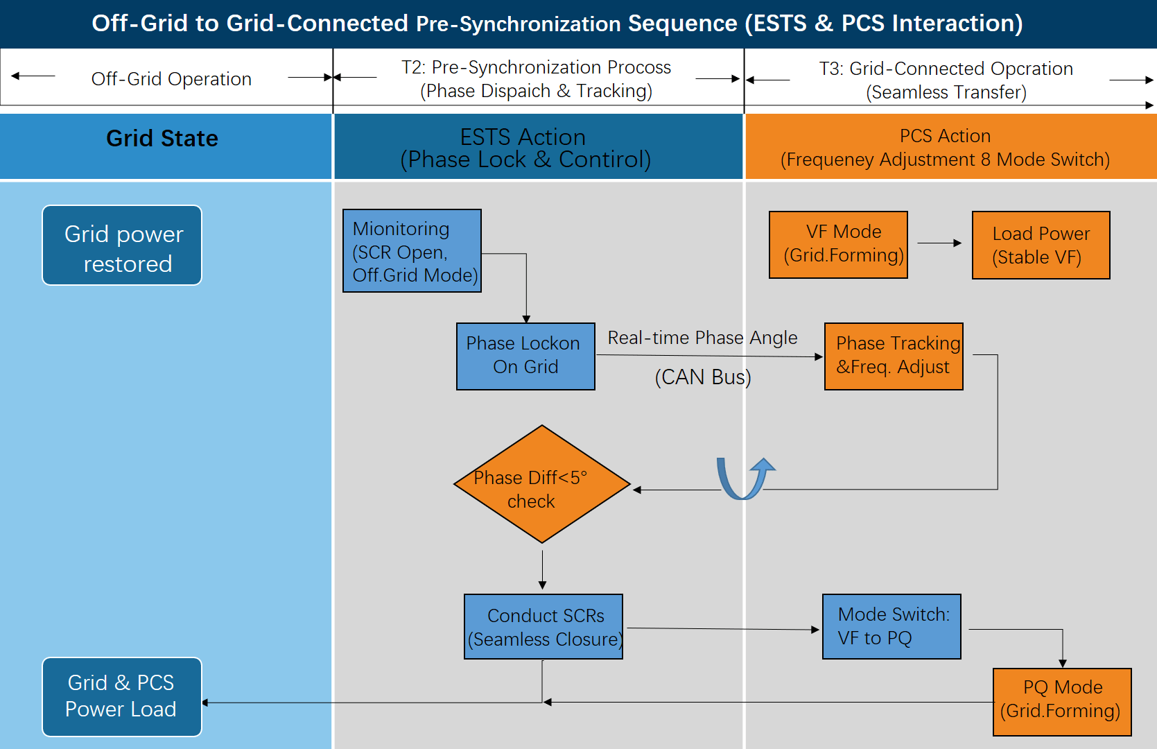 无缝闭合:当STS检测到相位差小于预设阈值(如5°)时,发出合闸指令:STS导通SCR的同时,PCS立即切换回PQ模式。这一动作的同步性至关重要,确保了平滑并网无冲击。
