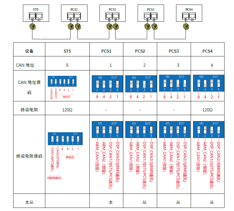 - PCS和STS的CAN地址拨码、终端电阻的拨码定义